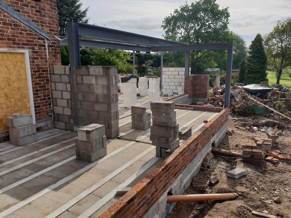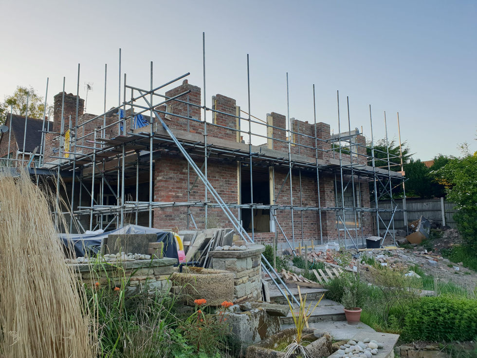 This project was a demolition of an old extension to build a new one with oak beam pillars featuring strongly around the property.
